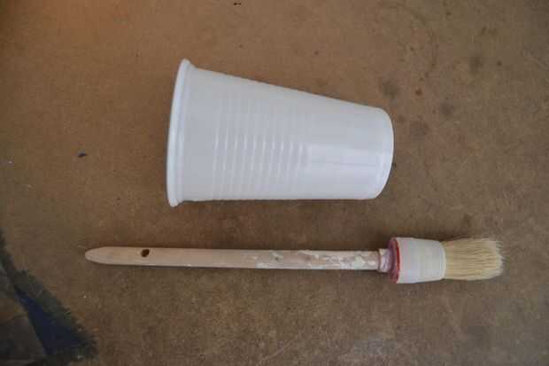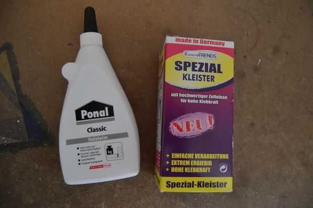 -pasta de cola y papel pintado y un vaso desechable para mezclar el pegamento de madera