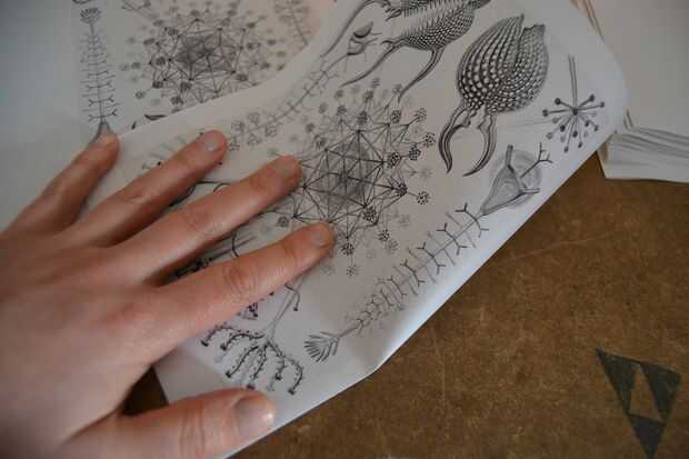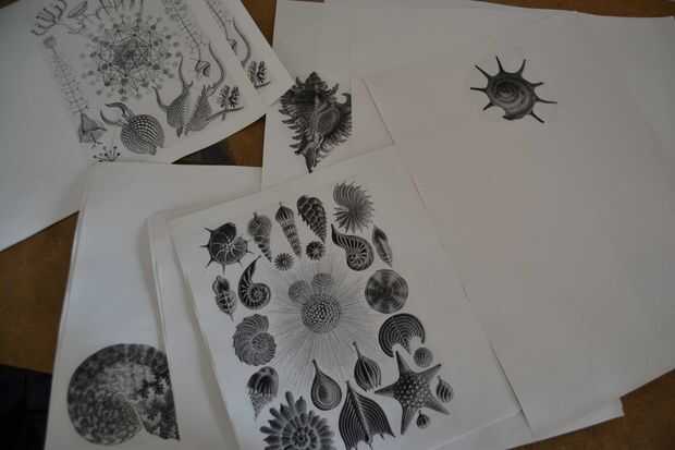 o, si se utiliza papel A4, puede imprimir en el papel antes de hacer las páginas. es lo que hice. desde mi papel de cubierta tiene alguna fauna submarina, quería tener algo de eso también en el interior, por lo que imprimí algunas imágenes de la impresionante colección de impresión "Kunstformen der Natur" sobre algunas de las páginas.