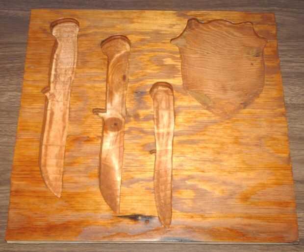Una vez que se construyen ambos componentes, es el momento de montar los elementos de pantalla. Arrainging ellos en el inserto, trazó alrededor de ellos y cortar hacia fuera sus contornos en un rompecabezas, sin embargo podría tener tan fácilmente utilizado una sierra de Copeing. En este punto, lo que sucede después depende de lo que vas a montar. Si todos los elementos de la pantalla 1/4 pulgada de espesor o menos, todo lo que se necesita hacer es pegar un segundo 1/4 pulgadas de madera contrachapada para la parte posterior de la inserción, terminar de una manera agradable y péguelo en la caja de la sombra. Si los artículos son más gruesos, tienes que utilizar un material más grueso y hueco hacia fuera según sea necesario. Recomiendo ir sólo el espesor de madera aserrada dimensionales, 3/4 de pulgada a la vez. La placa de cabeza de León que utiliza se encuentra en sólo un 1/4 de pulgada pero los cuchillos se fijan en más de 1/2 pulgadas por lo que necesitaba para pegar dos diferentes grosores de madera a la parte posterior de la inserción en los lugares adecuados. Usé un Dermel con un aditamento de fresadora para ahuecar, sin embargo, algunas herramientas de talla de la madera de mano hubiese funcionado tan bien.
