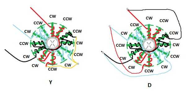 Iniciar los pasos sinuosos por a partir de 2 dientes antes de la primera de ellas envuelve. La imagen muestra la dirección a arrollar el hilo; A la derecha para derecha y CCW para contador en sentido horario. Cuando todos los dientes están envueltos; Utilice papel de lija para quitar el esmalte aislante en el extremo de los 6 cables. Los cables de tres final pueden soldarse juntos para una configuración Y para el par de la mayoría y menos rpm, o Conecte cada cable de final a uno de los otros dos cables a partir de una configuración de bajo esfuerzo de torsión de alta velocidad. Vueltas más significa más par y menos rpm, más hilos significa que hay menos espacio para las vueltas, pero puede manejar más corriente. Trate de dejar un margen de flujo de aire. Por último, vuelva a montar el motor.