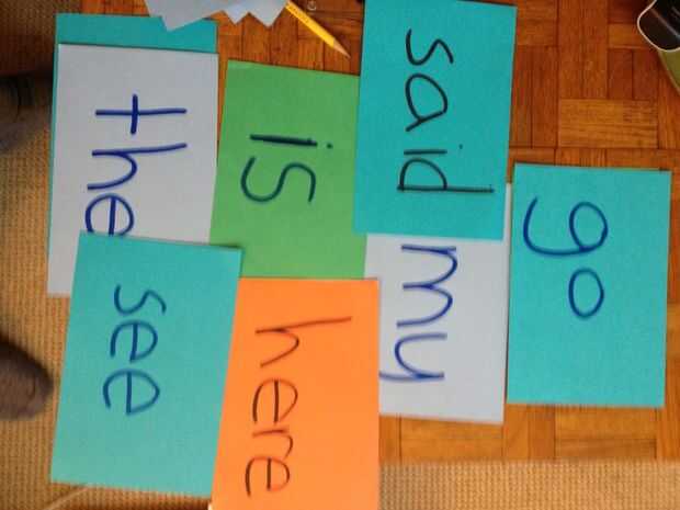 Cortar papel de construcción en 8.5x5.5inch. Escriba las siguientes palabras en las tarjetas con un marcador:, mi, quiero, una, ver, papá, mamá, el, perro, es, vaya, aquí, dijo y son.