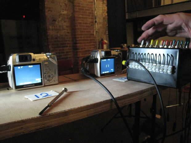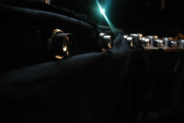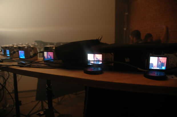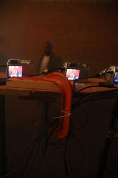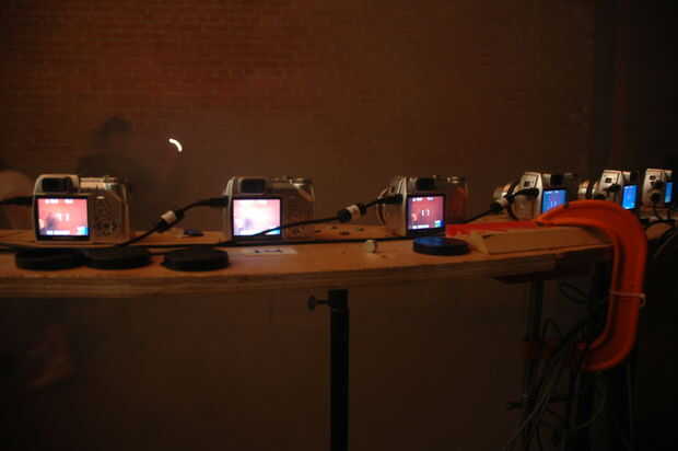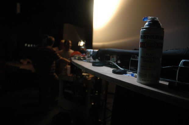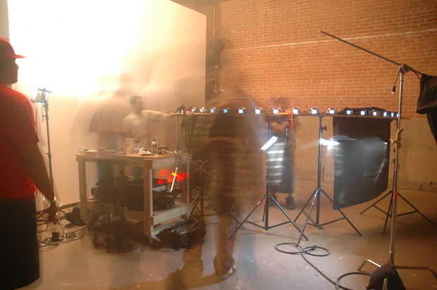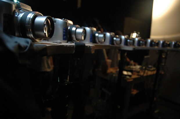 Mirar a través de las cámaras al final del arco y determinar cuánto de la plataforma es visible en el marco. Para evitar ver la actual plataforma en el tiro corte una hoja negra que cubre la plataforma de la parte superior al suelo. La hoja a la plataforma de la cinta y tire de él sobre las cámaras dejándola colgar hasta el suelo. Corte los orificios para cada cámara de que intenta cubrir y sacar las lentes a través. Asegúrese de que usted no cubren ningún elemento de enfoque automático de las cámaras si va a utilizar el enfoque automático (ver fotos abajo).