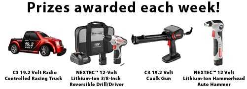 Primer premio: Una entrada será elegida al azar cada semana para ganar un coche de control remoto Craftsman C3, el martillo automático, Nextec taladro o la pistola de cola C3 de 19.2 voltios alimentado.