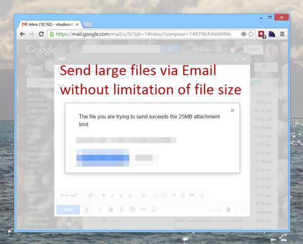 Seguimos en contacto con nuestro cliente a través de correo electrónico en la mayoría de los casos. Aunque varias herramientas de chat están disponibles en la actualidad, correo electrónico pagar todavía un papel importante durante el trabajo. A veces, puede que necesitemos transferir documentos, fotos, videos u otros archivos a los clientes para fines de trabajo. Sin embargo, un correo electrónico como Gmail, Yahoo mail, AOL mail etc. imponen el tamaño máximo para archivos adjuntos de 25 MB. No hay manera de enviar archivos más grandes que 25MB por correo electrónico. Google lanzó Google drive para el envío de grandes archivos limitado a 50MB, pero esto todavía no resuelve el problema básico. Afortunadamente, aquí es una manera fácil de enviar archivos grandes por correo electrónicosin limitación de tamaño de archivo.