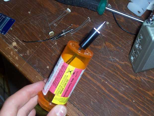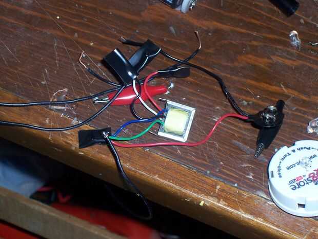 El circuito montado debería verse algo como esto. Asegúrese de no incomodar con el cable negro del transformador; no se utiliza en este circuito. La tapa de la botella de píldora (a la derecha) tiene dos agujeros perforados en él para el LED, que acabo de recibir de una luz solar patio. Haga todas las conexiones con pinzas de cocodrilo para probarlo, luego soldar todo junto cuando se sabe que funciona correctamente.