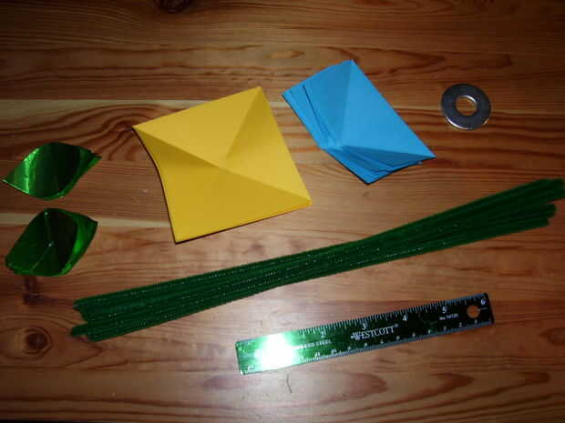 Hacer los pliegues en las piezas de papel y con cuidado los pliegues, pero despliegan para que puedan ser planas. Luego, escribe las instrucciones sobre cómo completar la flor en la envoltura de la carta, escribe cómo las flores y las hojas pueden ser adjuntas a los limpiadores de pipa, sugieren cortar el alambre a diferentes longitudes y atar los cables a la lavadora le proporcionan estabilidad. Entonces todo lo pone en los sobres grandes (los limpiadores de pipa necesita el espacio) y enviarla por correo a su localización deseada.