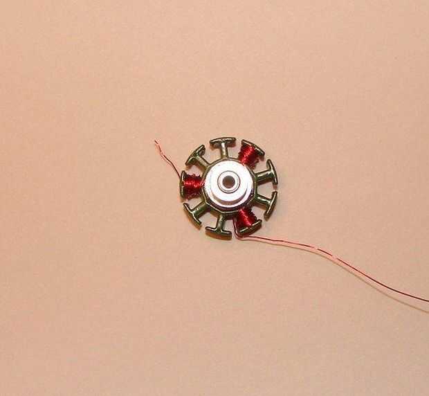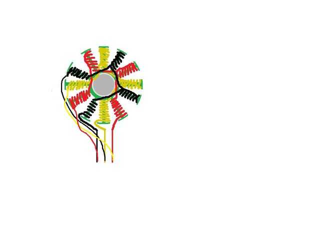 Mirando el cable amarillo, empezar a envolver en la sección inferior del poste después de dejar suficiente izquierda sobre alambre para ir a la ESC. Entonces, después de envolver el número deseado de vueltas, siga el cable al polo de la derecha, luego arriba, luego la izquierda. Lo mismo para los dos cables restantes. Entonces, usted debe dejar con tres cabos sueltos (se muestra en la imagen en el lado izquierdo del estator con el cobre pelado expuesto).