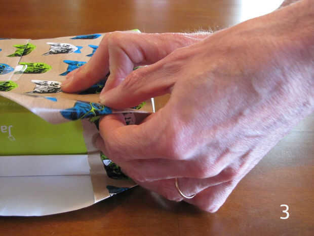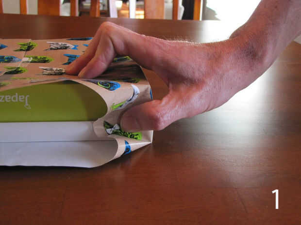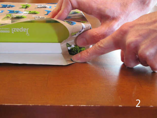 Empuje el lado derecho del papel con el pulgar contra el cuadro y hacer pliegues en las esquinas superiores e inferiores con la ayuda de su dedo indicador como se muestra en las fotos.