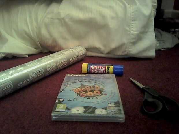 Cada vez que tengo que envolver un regalo, no tengo un cordón fantasía para decorarlo. Pero tengo un montón de materiales para elegir, y a veces los resultados son satisfactorios. Aquí os muestro una idea espontánea para envolver una caja mate y algu