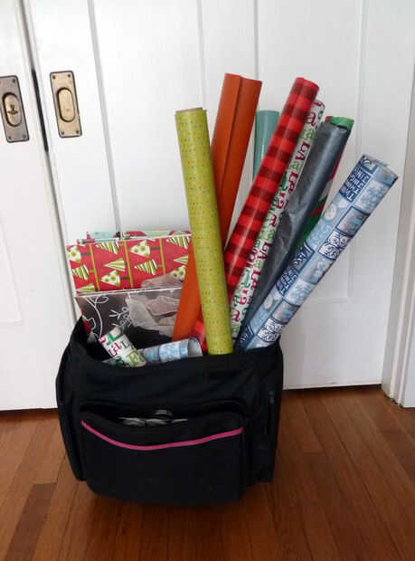 Se reúnen todos los suministros y los mantenga juntos por siempre. Encontrar un rincón de su armario y soporte para el rollo de papel en una bolsa de comestibles junto a la cinta, cinta y tijeras. Oh, un lápiz es una buena idea también, así que usted puede escribir el nombre del destinatario en el regalo!