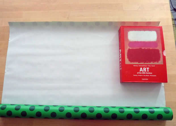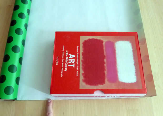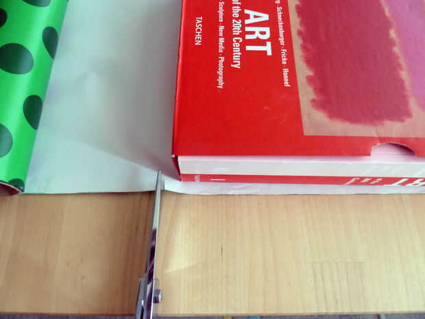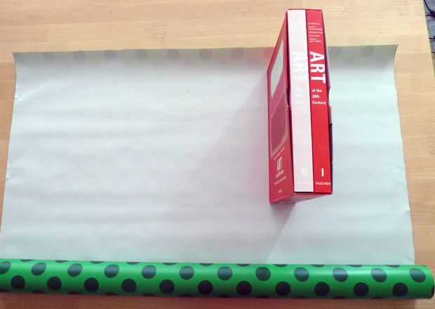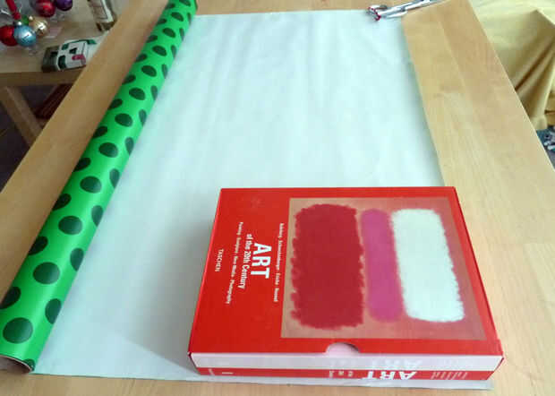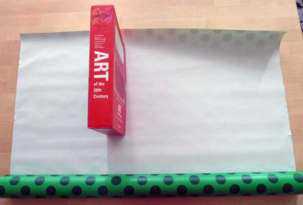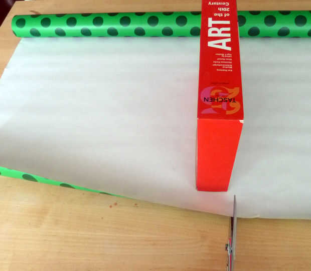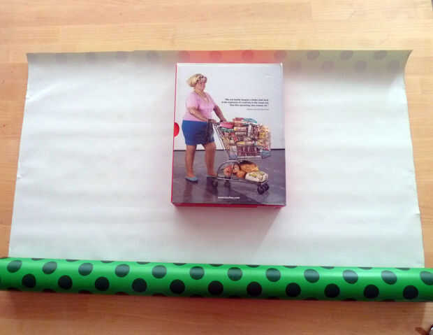 Rodillo de la caja a lo largo de la otra dimensión del papel cuatro veces (ver fotos 5-8). Esto es la longitud que usted cortará su papel. Corte una muesca para marcarlo.