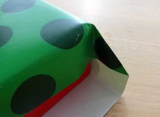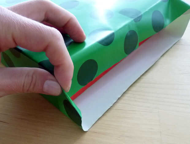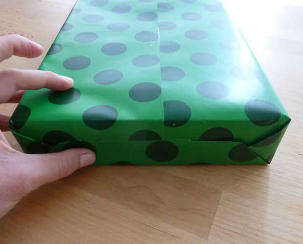 A continuación vamos a los extremos. Para hacer que su caja esté centrada, use ambas manos para pliegue los bordes superiores de cada extremo. De esta manera tu regalo es menos probable que deslizarse mientras estás grabando hasta los extremos. (Imagen 6)