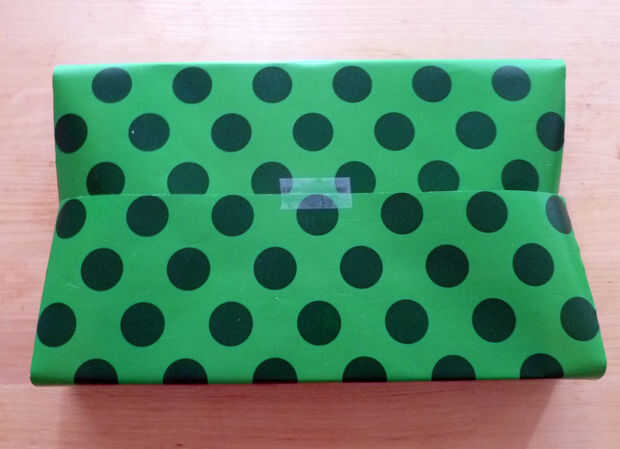 Gire la caja para que un extremo quede frente a usted. Pliegue la parte superior del papel hacia abajo sobre el lado limpio. Esto formará dos alas triangulares en cada lado. Pliegue los bordes. (Fotos 7-8)