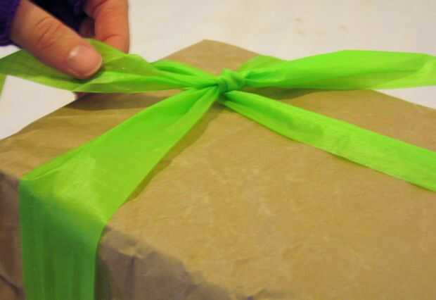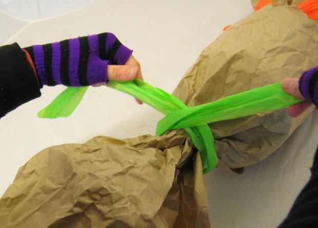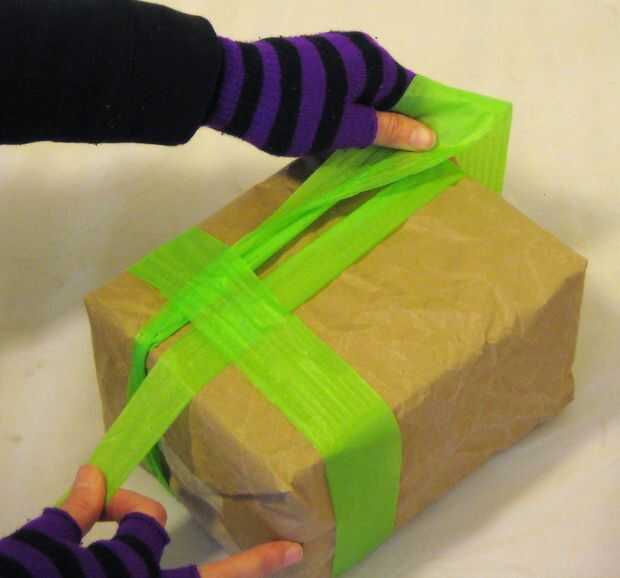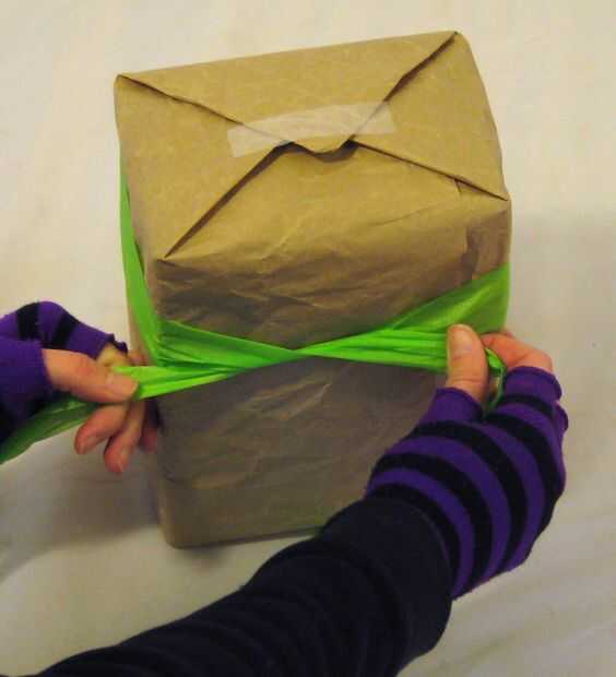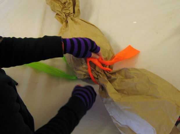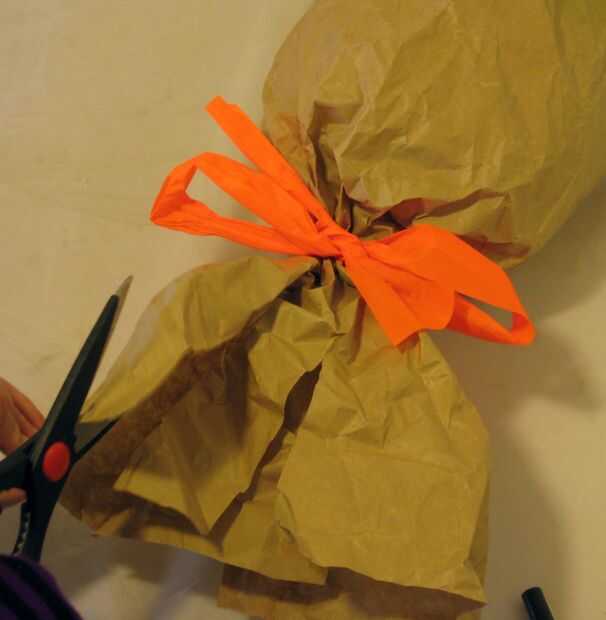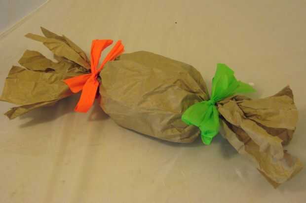 Estilo caramelo duro: Envuelva una longitud de cinta alrededor de una de las secciones estrechas aplastada de papel de embalaje. Empate en un arco. Repita en el otro extremo. Agregar una etiqueta. Fantástico!