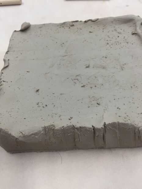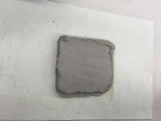 Cortar 2 1" de espesor, piezas de barro. Asegúrese de que es el mismo tipo de arcilla que se utiliza para generar la cabeza. Utilicé arcilla de Phoenix bajo fuego para la cabeza. No se recomienda la mezcla de arcillas. Apriete juntos para formar un rectángulo largo.