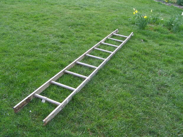 he añadido un camión rueda a una escalera de extensión de 15 pies por lo que una persona puede mover con facilidad con una mano en el lugar donde se utilizará.MaterialesDos ruedas de cortadora de césped de 6 pulgadasbarra de refuerzo de concreto de 3