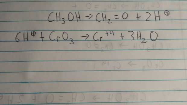 A continuación debemos balancear los hidrógenos añadiendo protones (H +) a las reacciones. La reacción media de metanol tiene 2 hidrógenos más a la izquierda que la derecha, por lo que añadimos 2 protones a la derecha. La reacción del trióxido del cromo ahora tiene 6 hidrógenos más a la derecha que la izquierda debido a la adición de agua en el ultimo paso, agregamos 6 protones en la izquierda.
