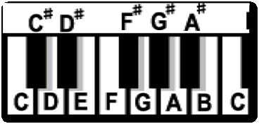 Para contar los pasos enteros y medio pasos para nuestro propósito, se empieza en la nota que has elegido (C en nuestro ejemplo de la escala mayor de C) y contar los pasos de la mitad de izquierda a derecha. Una mitad paso equivale a una nota, y las notas son las notas ambos blanco y las notas negras. Por ejemplo, el paso de mitad para arriba de G es G #. Una nota de todo hasta de G es A.