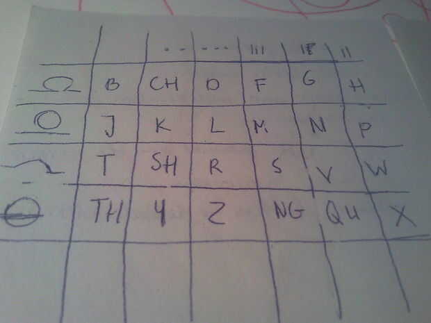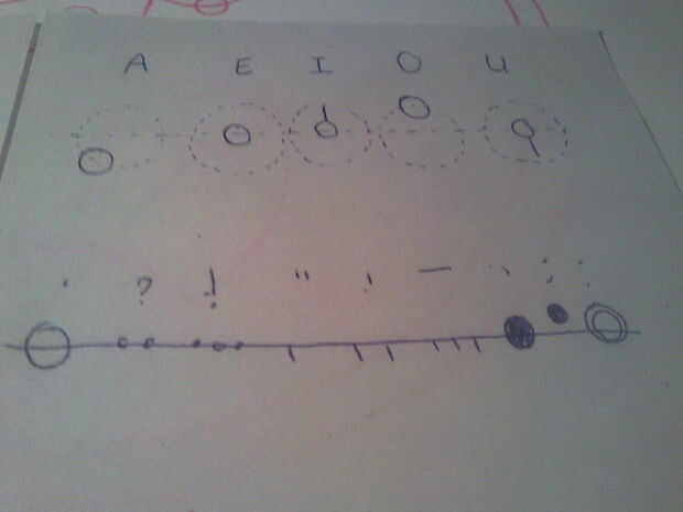 Tomar un nuevo trozo de papel y escribir la cita (sólo de referencia). Debajo de él, llamo a la cantidad de círculos para esta cita (tercera imagen). El círculo de 'of' es intencionalmente más pequeño, porque sólo tiene dos signos en él. Palabras como 'a', 'la', 'me', etc. son más fáciles de dejar pequeñas.