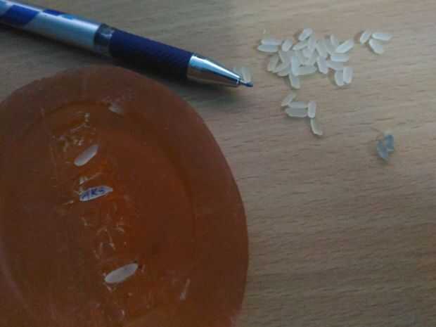 Primero de todo tomar jabón barra, poner arroz en los espacios en el nombre del jabón o si no hay ningún espacio en jabón usar ningún objeto punzante para hacer alguna brecha para ponerlo como objeto pinzas o sharp.