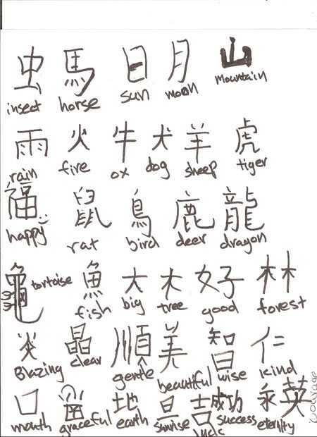 La historia de los caracteres chinos es que comenzó como PICTOGRAFÍAS. Todavía se basa en pictogramas, pero no todos. Evolucionaron a aquí. Por ejemplo, los personajes de "árbol" y "bosque" son como y lucen como simples árboles. Realmente he utilizado un rotulador para escribir todo esto, pero si yo fuera un muchacho chino verdadero (que soy) lo hubiese hecho en tinta y un pincel o un lápiz caligraphic. Hay 3.000-4.000 caracteres chinos en la actual. Cómo busque en internet no sé (luego keybaord bastante grande). Estos no son graves