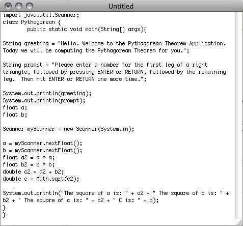 Prompt cadena = "Escriba un número para la primera etapa de un triángulo rectángulo, seguido de presionar Intro o retorno, seguida por la pierna restante. Continuación, pulse ENTER o volver una vez más. ";