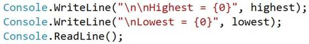 Console.WriteLine("\n\nHighest = {0}", highest); Console.WriteLine("\nLowest = {0}", lowest); Para este ejercicio sólo de aprendizaje, se recomienda utilizar una pausa después de la impresión anterior, por lo que el programa permanece abierto cuando haya terminado. Esto le permitirá ver los resultados en lugar de salir por su cuenta. Para hacer una pausa, simplemente use la siguiente línea de código como la última línea debajo de todo el otro código. Observará la ventana negra de consola permanecerá abierta después de que termine su programa de ejecución.