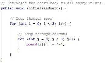 Esto ajustará la Junta a todos los valores vacíos. Dentro de este método, debe crear 2 para bucles dentro de unos a otros a recorrer todas las filas y columnas si cada espacio en '-'. Para recorrer las filas, crear un bucle y un entero, en este caso llamado i, para representar que fila actualmente estamos observando.