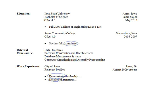 Cuando sea apropiado debe incluir algunas frases que describen brevemente sus experiencias. Estas frases pueden ir en cualquier sección (que no sea el objetivo, supongo) y debe ser colocados directamente después del elemento que desea señalar. En la primera imagen abajo hay algunas frases en un par de las secciones, y se dará cuenta de que algunas de las palabras están en un círculo; estas palabras dentro de un círculo son verbos de acción. La mayoría si no todos de sus frases deben incluir un verbo de acción, porque coge inmediatamente la atención del lector. Las dos últimas imágenes muestran diferentes formas de formatear las secciones con eficacia.
