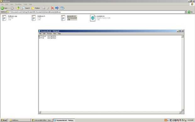 con el archivo de palabras clave nada de nuestra biblioteca sería reconocido por el medio ambiente y puso de relieve en color. Cada línea tiene el nombre de la clave, seguido de una tabulación, seguida por el tipo de palabra clave. Las clases deben ser KEYWORD1 y son color naranja; las funciones deben ser KEYWORD2 y serán marrón.