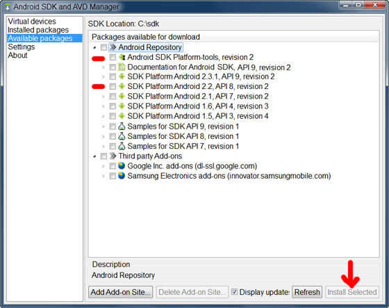 Por el bien de este tutorial, sólo debe instalar "Android SDK Platform Tools, revisión 2" y "Plataforma SDK Android 2.2, API 8, revisión 2".