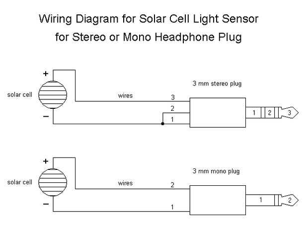 En palabras la punta de una clavija mono de audio se llama "punta", y el anillo en forma de conductor detrás de la punta se denomina "anillo". He conectado el lado positivo del panel solar a la punta y el lado negativo a un anillo. En el pequeño cuadro en el diagrama de cableado, anillo está etiquetado con un "1".