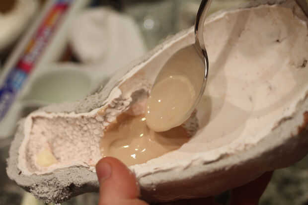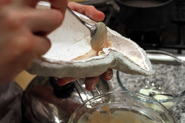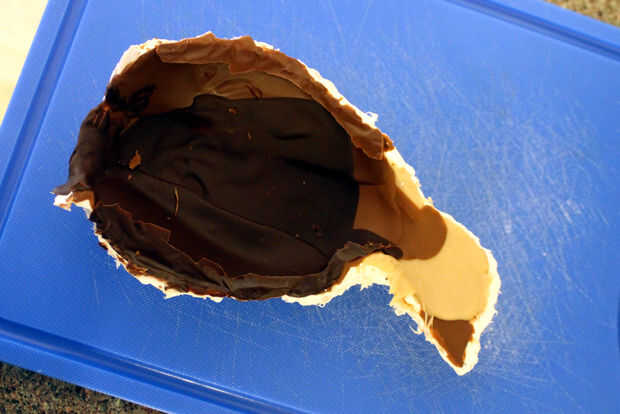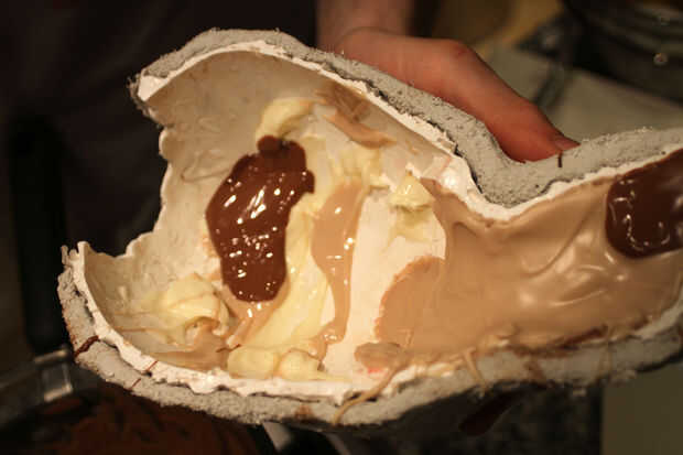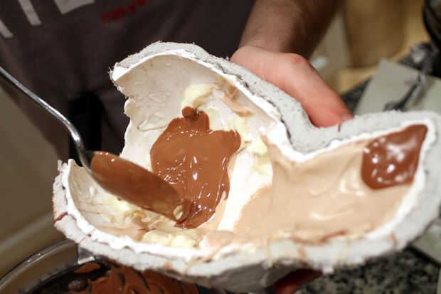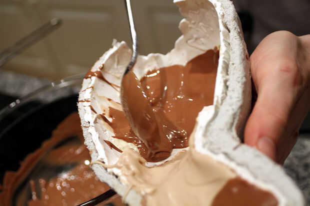 Una vez que ha cubierto el molde entero y dejarlo establecido, aplicar otra capa de chocolate en el interior. Utilice el reverso de una cuchara para extender esta capa hacia arriba los bordes para que las costuras del molde no demasiado finas. Lo ideal es repetir este proceso dos o tres veces, en el medio de enfriamiento. Si el chocolate es delgado en los bordes del molde solo se agrietará al intentar quitarlo, así que es bien vale la pena este derecho de la etapa.