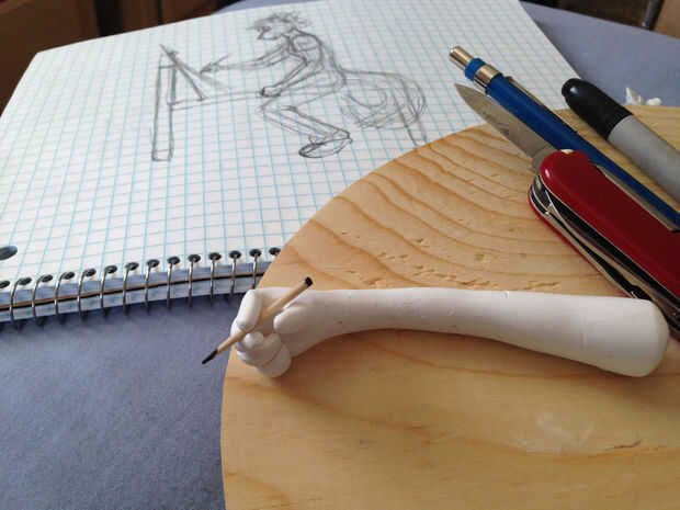 puesto que la anchura del asiento es de 12" pulgadas utiliza un poco de matemáticas para deducir que la escala sería 1/8 del tamaño de un caballo verdadero arte. Entonces como se puede ver en la segunda foto que bosquejar una imagen de tamaño real de cómo encajaría en la escultura del caballo. (También estaba jugando con la arcilla sculpey y hecho un brazo para conseguir una sensación para él otra vez. No he hice una de estas piezas durante unos años.)
