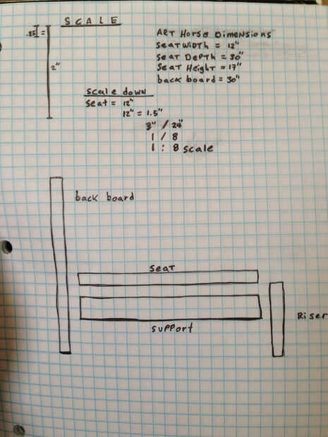 Después de elegir el personaje y el telón de fondo, luego decidí trabajar en la escala de la pieza. Los apoyos para la construcción realmente ayudaron en el logro de una adecuada escala abajo de todo el modelo. Comencé haciendo la investigación sobre el "arte Horse" que gato se sienta en su clase. Usando papel cuadriculado y algunos planes en línea para encontrar las dimensiones del caballo. a partir de ahí sacó una figura de tamaño real. La madera que utilicé para el caballo de arte fue hecha de un palillo de la yarda ciento 88 en una ferretería. usando el papel de la red se puede ver esa plaza de pulgada un cuarto, equivale a dos pulgadas.