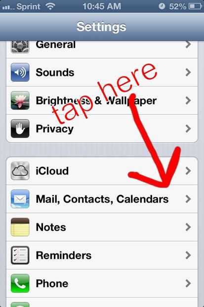 Desplácese hacia abajo hasta encontrar el icono "Mail, contactos, calendarios". Pulse en él.