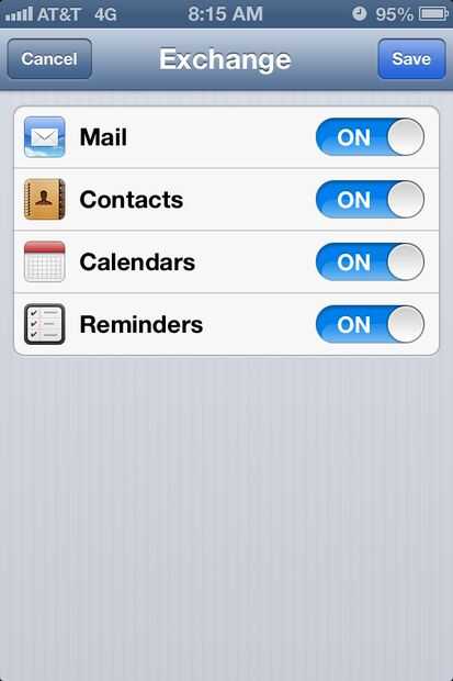 Teléfono debería indicar qué elementos quieres sincronizar con tu cuenta. A su vez que los artículos "El" que desea han conectado con su TechMail. Girar los elementos "Off" que no quiera que haya conectado con su Techmail. Presione "Guardar" en la esquina superior derecha de la pantalla una vez hecho esto.