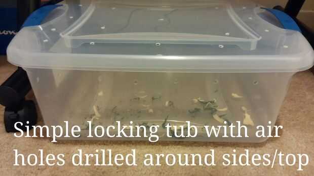 creo que es más fácil sacar el animal de hábitat para limpiar. Para ello utilizo una tina de bloqueo con varios agujeros de aire perforados alrededor de los lados y la parte superior. Puede hacer que el animal más cómodo que si agrega una piel mientras él está en la bañera también, esto puede ser algo simple como una taza o un tazón de fuente en que del animal puede arrastrarse. Es importante mantener el tanque limpio y reemplazar el sustrato como se ensucie.
