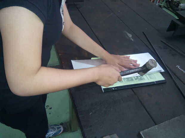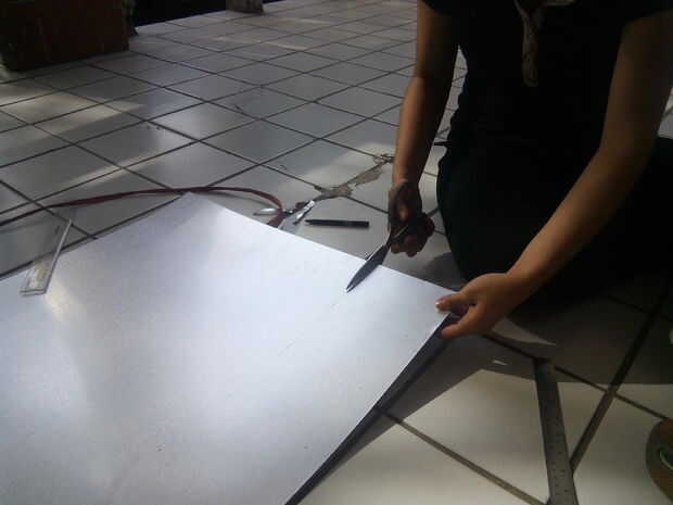 En primer lugar, encontrar cualquier metal, debe ser enlazable. Estaba usando un metal llamado galvalum 03. Era delgado y puede ser cortado por una tijera. Dibujar el diseño, cortar, atar y presione el campo de atar con un martillo de plástico para que no tenga ningun lado agudo.