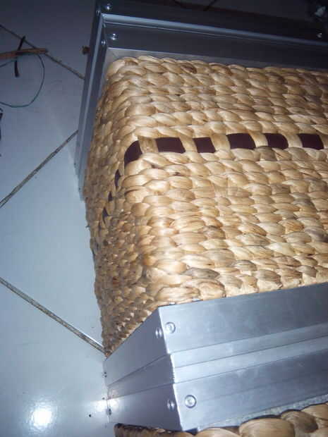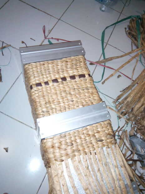 Después de lavado el jacinto, conseguir el Jacinto sin lavar, y comienzo pegarlo a la forma. Estoy usando una cinta y una cinta habitual. Pegar todo alrededor de la forma y recuerda, el palillo encima debe ser más largo que la forma. Si listo, empezar a trenzar. El tutorial Cómo para esta trenza se puede encontrar en youtube. Utilizo alguna imitación de cuero en el centro para darle un aspecto agradable.