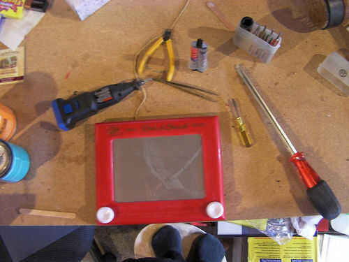 recientemente encontré un etch a sketch en mi armario y se interesó por el dibujo con ella. Llamo sobre todo imágenes de los libros mientras estoy sentado en clase de inglés, o imágenes de carteles en otras clases. Es una gran manera de utilizar su t