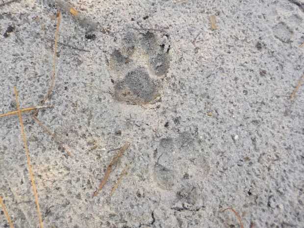 Pistas de Coyote son fáciles de identificar cuando se encuentran. Parecen similares a pistas de perro, sin embargo la Cierva pista (como se ve en la esquina inferior de la foto de arriba) es muy delgada y estrecha. Las marcas de la garra son siempre visibles.