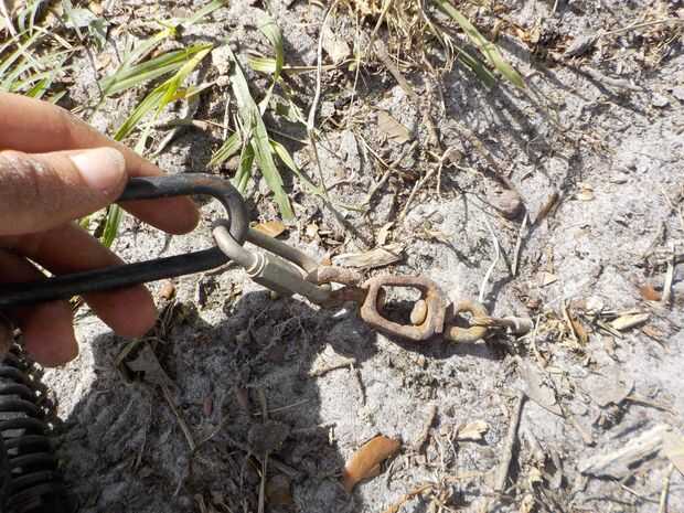 Hay varias opciones diferentes para el replanteo de la trampa. Yo prefiero usar anclas de tierra, que son de peso ligero pero extremadamente robusta cuando se clavan en el suelo. Un ancla de tierra consiste en una espiga de metal conectada a unos 12" de cable de acero y un enlace giratoria al final. La espiga es conducida en la tierra con una varilla de metal. Luego se retira la varilla, y la espiga es la trampa en el suelo por su tensión contra la suciedad. Cuando conducido en correctamente, él simplemente no puede extraer a menos que usted físicamente cavarlo hacia fuera con una pala!
