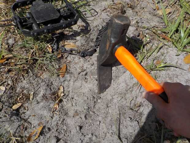 Después de la trampa es estacada abajo, cavar hacia fuera una "cama baja" para con su martillo de uña o paleta. Coloque la trampa de establecer firmemente en esta cama y paquete la suciedad firmemente alrededor del exterior de las mandíbulas de la trampa no rock ni moverse bajo los pies del animal cuando se acerca el gatillo. Las mandíbulas de la trampa deben estar niveladas con el suelo alrededor de él, no cualquier mayor o menor. El pan del gatillo debe ser de igual nivel con las mordazas, o algo inferior.
