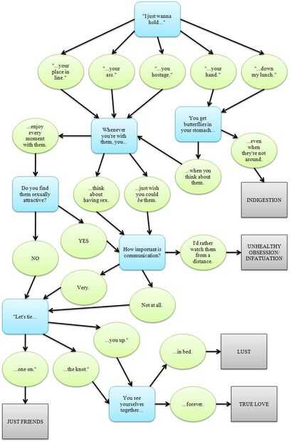 Es importante determinar lo que usted está experimentando, ya sea amor, lujuria o simplemente un caso de indigestión. Revisa el diagrama de flujo crudo abajo: (haga clic aquí para ver más grande, o haga clic en la "i" en la esquina superior izquierda).