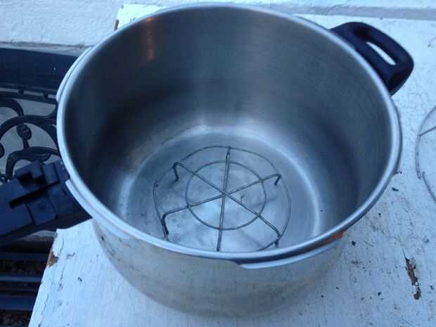 techshop.ws) en unos minutos con unas tijeras de alambre, e hice otro en unos minutos en casa para mostrarle lo fácil que puede ser. Su diseño puede variar, pero este material tiene que ser capaz de soportar el contenido de la autoclave de la parte inferior de la olla a presión donde tienes agua (según las instrucciones del fabricante). Mi manual dice que use 2 tazas mínimo cuando usted está cocinando durante 10 minutos o más. Esto es porque el vapor escapa de la olla y quiere agua suficiente allí para generar vapor durante el tiempo deseado.