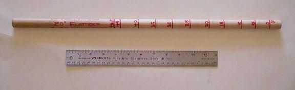 El paso final consiste en una varilla de combustible de madera simple de la manera. Yo prefiero un pasador de madera de 11/16 de pulgada de diámetro, arena suave, el tiempo suficiente para tocar el fondo interior del tanque de combustible y también el tiempo suficiente para no caer en el tanque y se pierde. Una varilla de madera redonda es más fácil eliminar totalmente cualquier combustible que no huele a la cabina del camión. Yo uso un "Sharpie" punto fino con punta de fieltro marcador permanente, ya que es a prueba de combustible. Pero todas las marcas preliminares a lápiz, antes de finalizar con el rotulador. La primera marca es "0" galones, basados en el nivel superior de ese 7% en el combustible no utilizable. A continuación, sumerja el palillo en el tanque de combustible, verticalmente, hasta que toque el fondo del tanque de combustible. Marque cuidadosamente, con un lápiz, donde la parte inferior del cuello de combustible, en la parte superior del tanque, toca la varilla de madera. Retirar la varilla de nivel del tanque, trapo seco y marque cuidadosamente, con el rotulador, completamente alrededor de la varilla en el verdadero vaciar el nivel y la etiqueta "0" y "vacía" (aproximadamente una pulgada desde el final de mi varilla, por ejemplo) y hacer lo mismo con la capacidad de combustible máxima verdadera ("46,5" galones mi varilla, por ejemplo).