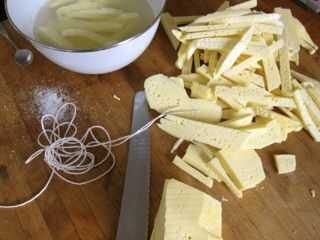 Es posible que el cuajo necesario para este Instructable siguiendo una receta como esta ("cómo hacer el éxito rápido Mozzarella cuajada"). O usted podría decidir hacer una receta de cuajada de mozzarella más compleja a través de la leche con bacterias de cultivo. O pueden comprar prefabricadas mozzarella cuajada de un fabricante local (tales como Bel Fiore en Berkeley, CA). Una vez has conseguido algunos cuajada, proceder con el calentamiento hasta la temperatura ambiente, luego lo picado en rodaja o mordeduras (aproximadamente del tamaño y la forma de obleas de vainilla o zanahorias delgadas).