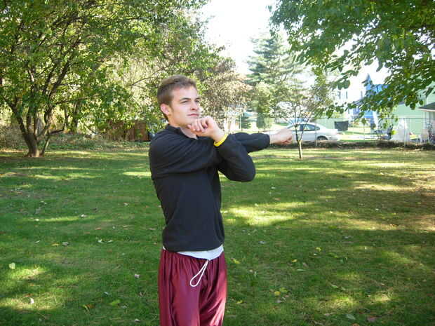 Con su brazo derecho sobre el pecho, usar su brazo izquierdo para empujar tu codo derecho hacia el pecho. Otra vez, durante 10-30 segundos, luego cambie a la izquierda.