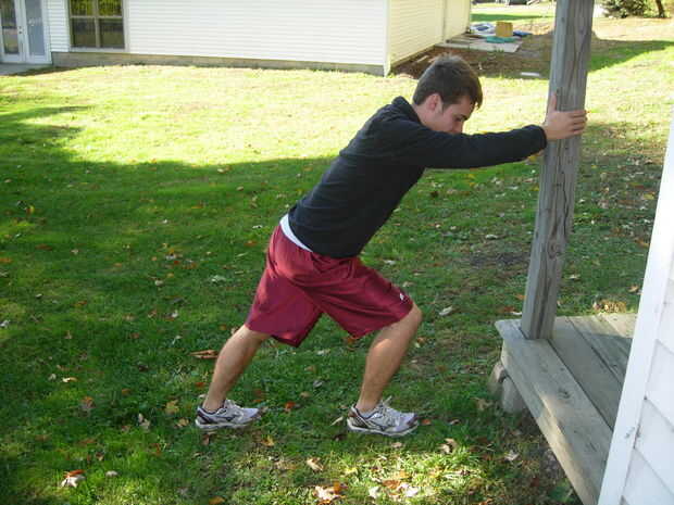 Suponga que usted tiene algo de apoyo de la contra; contigo las palmas contra el soporte, poner una pierna adelante y otra atrás. La pierna que está más lejos de la pared será el estirarse. Debe sentir un tirón en la pantorrilla. Sostener y luego las piernas.